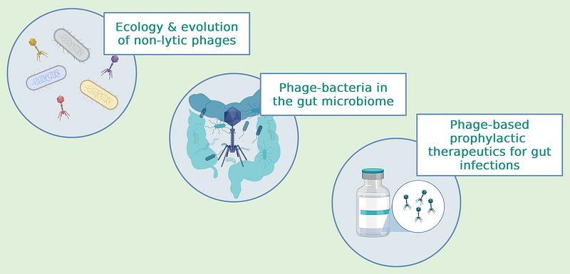 By working at different levels of biological complexity, from clonal populations to complex microbial communities, we aim to elucidate phage-bacteria interactions in diverse backgrounds. Utilizing a multidisciplinary approach, we employ a diverse array of techniques such as molecular biology, experimental evolution, in vivo infection experiments, genomics, and mathematical modelling. This holistic approach enables us to explore antimicrobial resistance, infectious diseases, and phage therapy from various angles, leading to a comprehensive understanding of these complex phenomena and advancing phage therapy applications in gut infections.